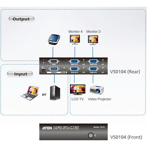 ATEN VanCryst VS0104 Signal Splitter - Metal - 1920 x 1440 - 450 MHz Maximum Video Bandwidth - 65 m Maximum Operating Distance - Audio Line In - Audio Line Out - Serial Port - VGA In - VGA Out Menos